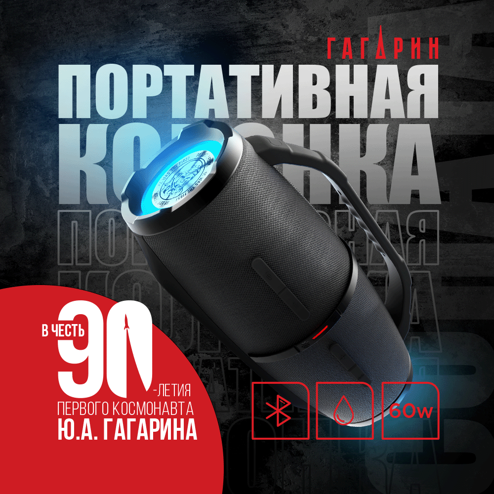 СохранитьПортативная Bluetooth колонка Урал Гагарин ГР-007 черная, водонепроницаемая IP67, 60 Вт Мощность, TWS, FM-радио, беспроводная интересное: