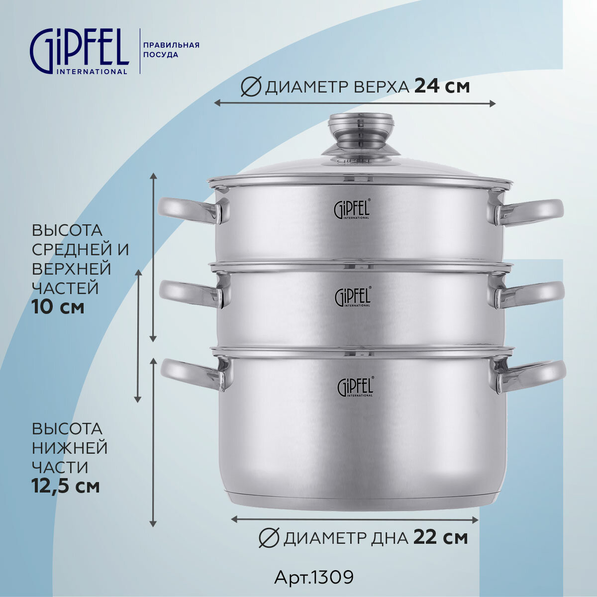 | Минусы: | Люфт между установленными ярусами как писали ранее присутствует, через щели проходит пар. Для дорогого бренда странное качество товара. Пользоваться можно, готовит хорошо. Купил только из-за бренда, так как пользуемся только Gipfil |