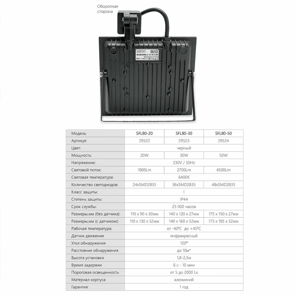 SAFFIT Прожектор светодиодный SFL80-20 с встроенным датчиком 2835SMD 20W 6400K AC220V/50Hz IP44, черный в компактном корпусе 29522