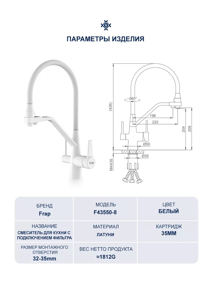 Ниже Вы можете прочитать отзывы на Смеситель для кухни Frap F43550-8 с подключением фильтра, цвет белый, ознакомится с подробными характеристиками, посмотреть интересные обзоры и фотографии на Смеситель для кухни Frap F43550-8 с подключением фильтра, цвет белый.