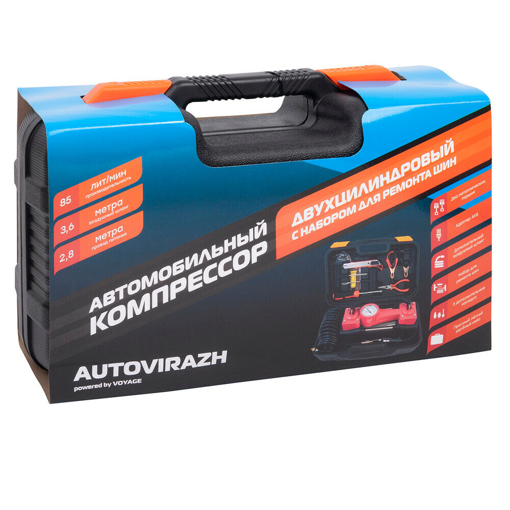 AUTOVIRAZH Компрессор двухцилиндровый 85 л/мин в кейсе с набором для ремонта колес , шт AV-010890