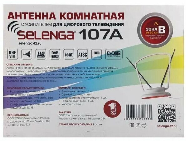 Ниже Вы можете прочитать отзывы на Антенна комнатная с усилителем SELENGA 107А для цифрового ТВ. МВ, ДМВ диапазонов., ознакомится с подробными характеристиками, посмотреть интересные обзоры и фотографии на Антенна комнатная с усилителем SELENGA 107А для цифрового ТВ. МВ, ДМВ диапазонов..