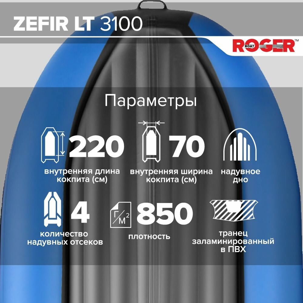 СохранитьЛодка надувная ПВХ под мотор ROGER Zefir 3100 LT, лодка роджер НДНД малый киль (синий-черный) интересное: