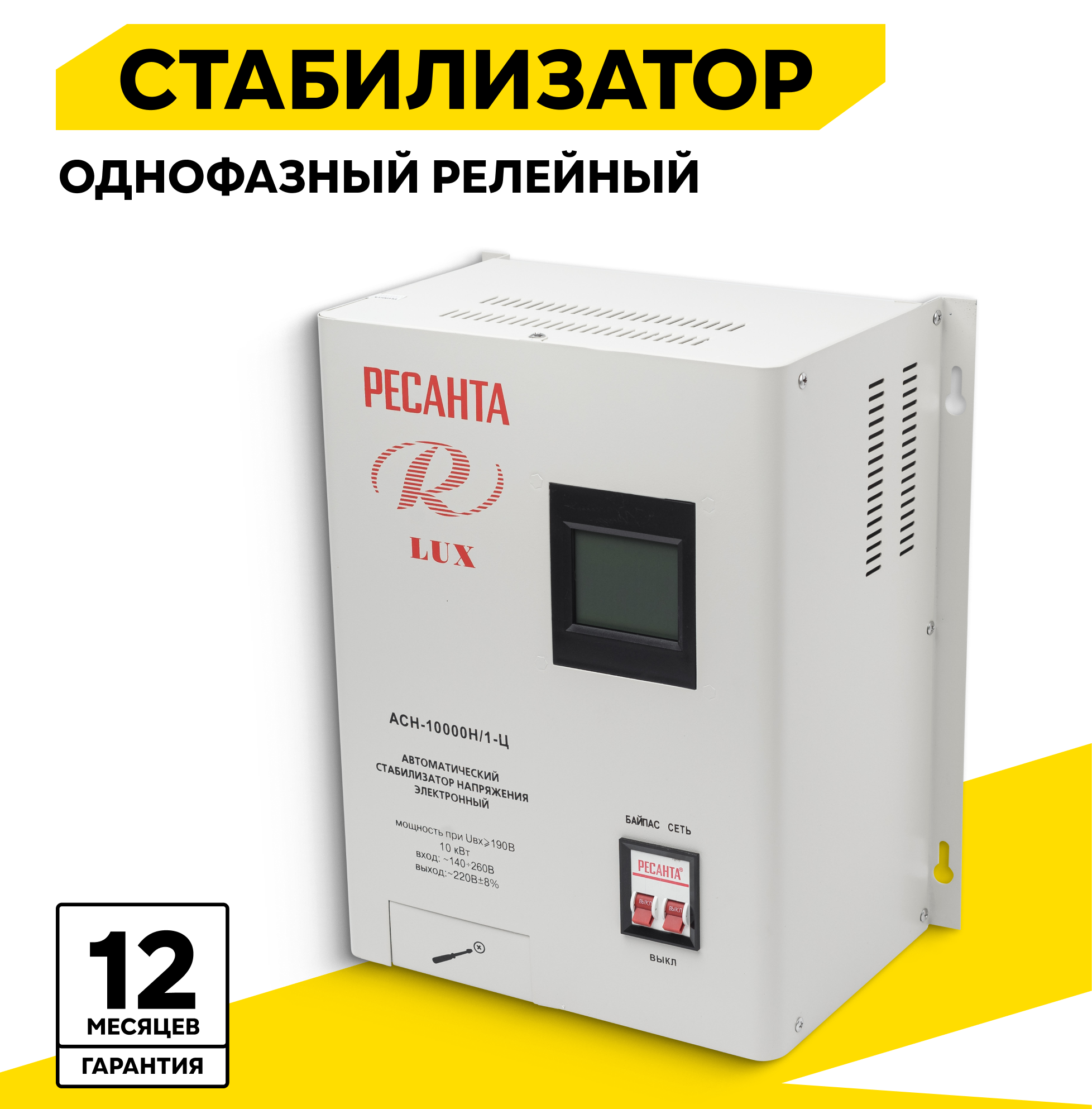 Стабилизатор напряжения АСН-12000 Н/1-Ц Ресанта Lux настенный, однофазный; 12000 Вт; 63,2А; клеммы; LСD-дисплей; 140-260В