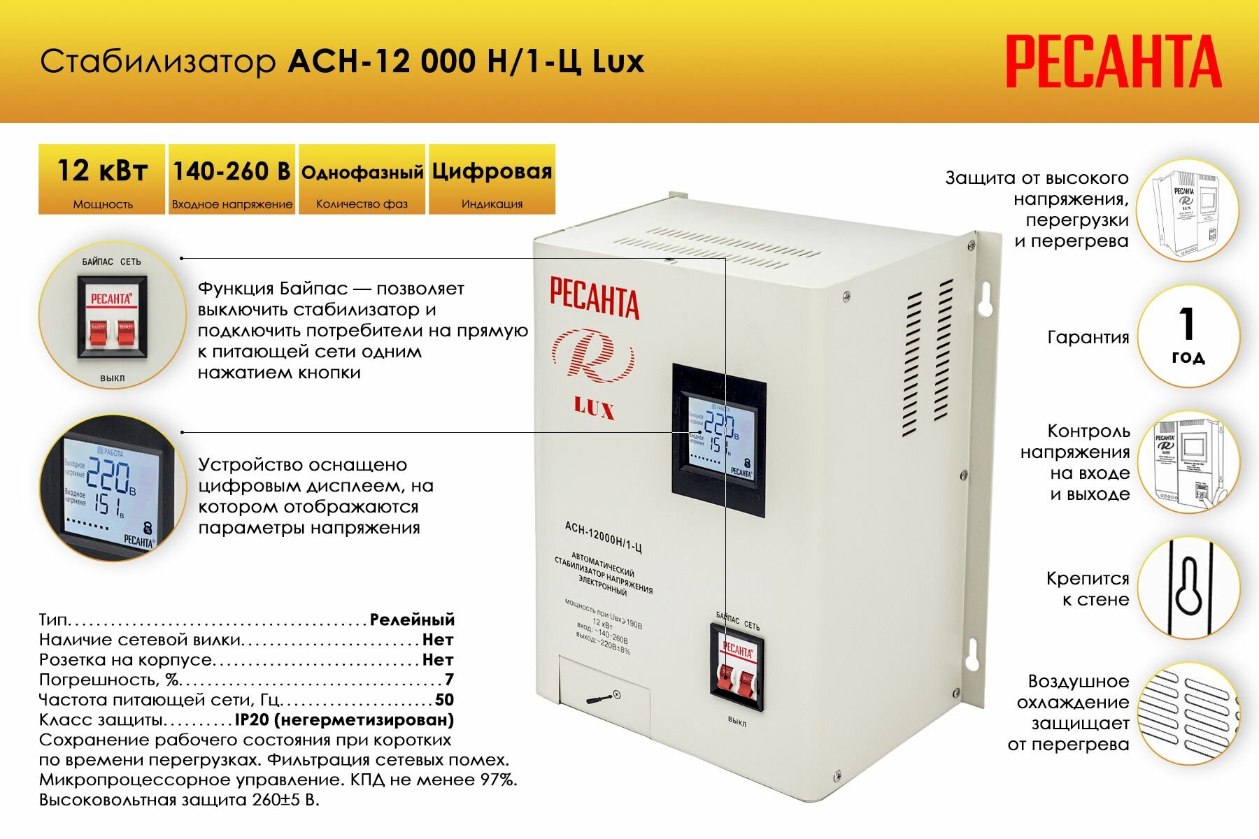 СохранитьСтабилизатор напряжения АСН-12000 Н/1-Ц Ресанта Lux настенный, однофазный; 12000 Вт; 63,2А; клеммы; LСD-дисплей; 140-260В интересное: