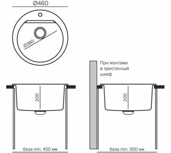 Мойка POLYGRAN, гранит-мрамор, ATOL-460, (d=460*200 мм), черный, сифон и сливная арматура