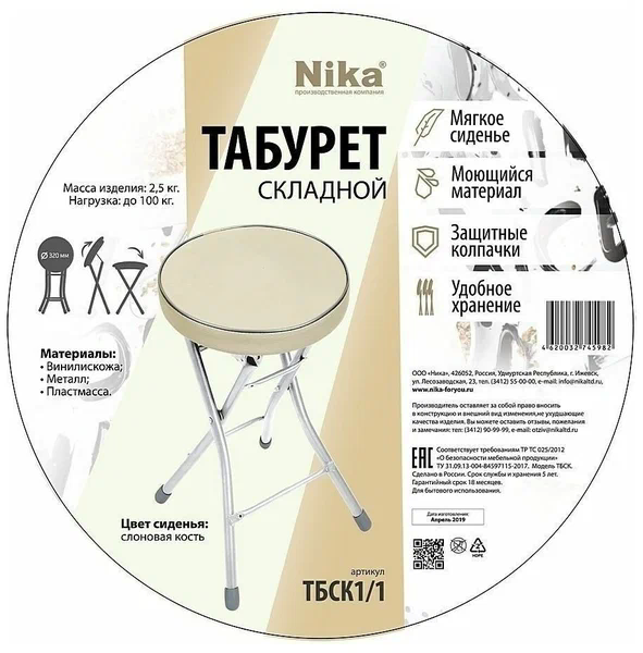 Табурет складной с мягким сидением d=32 см ТБСК1/1 Nika слоновая кость