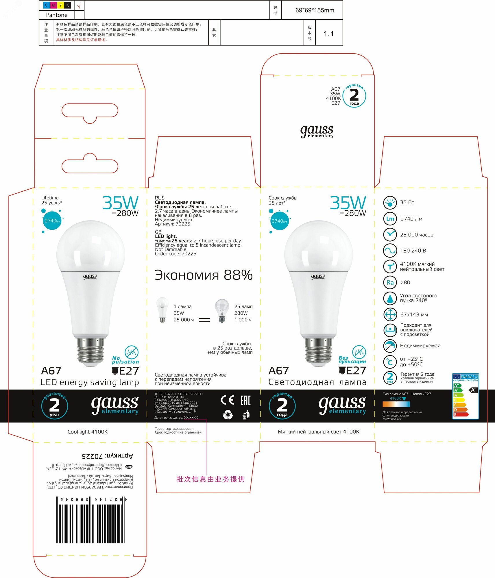 (2 шт)Лампа светодиодная GAUSS ELEMENTARY A67 35Вт 4100K E27