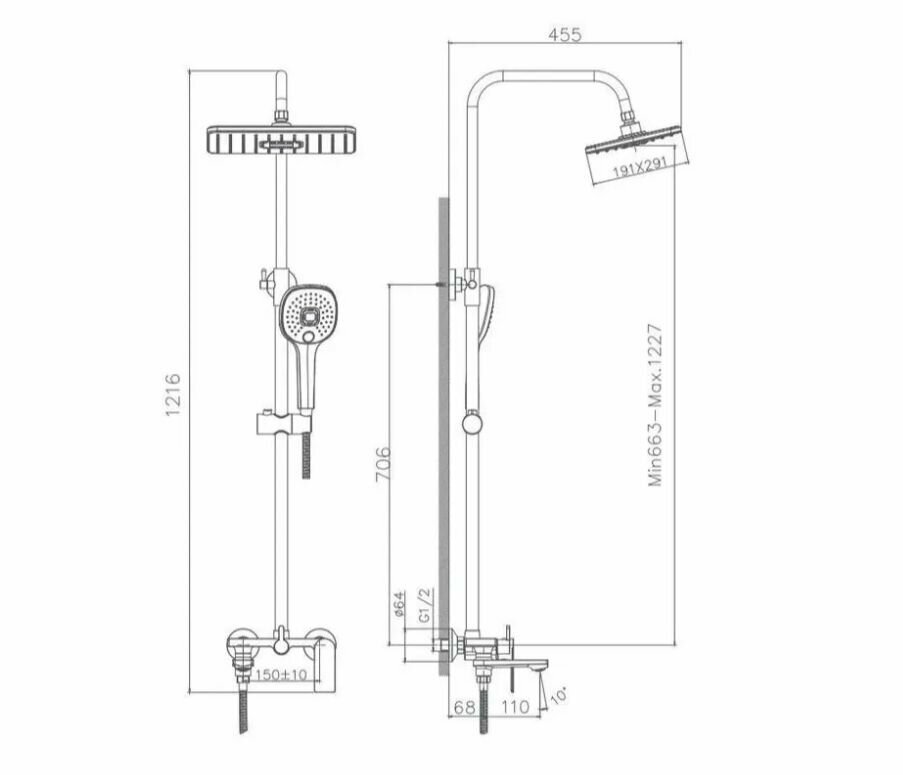 | Комплектация | душевая лейка / шланг для душа / верхний душ / кронштеин для верхнего душа / душевая стойка / Смеситель / аэратор / эксцентрики |