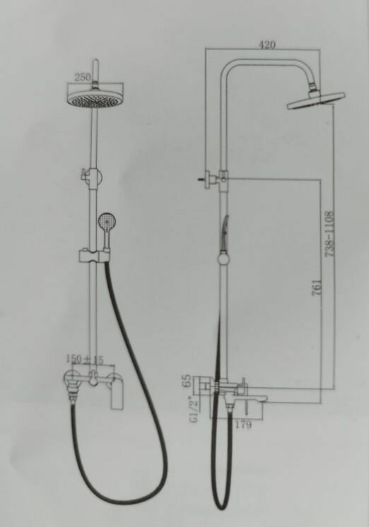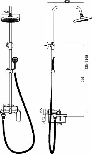 | Комплектация | душевая лейка / шланг для душа / верхний душ / кронштеин для верхнего душа / душевая стойка / Смеситель / аэратор / эксцентрики |