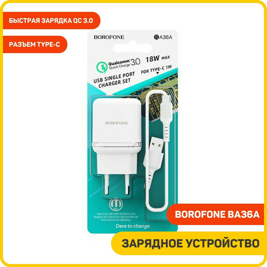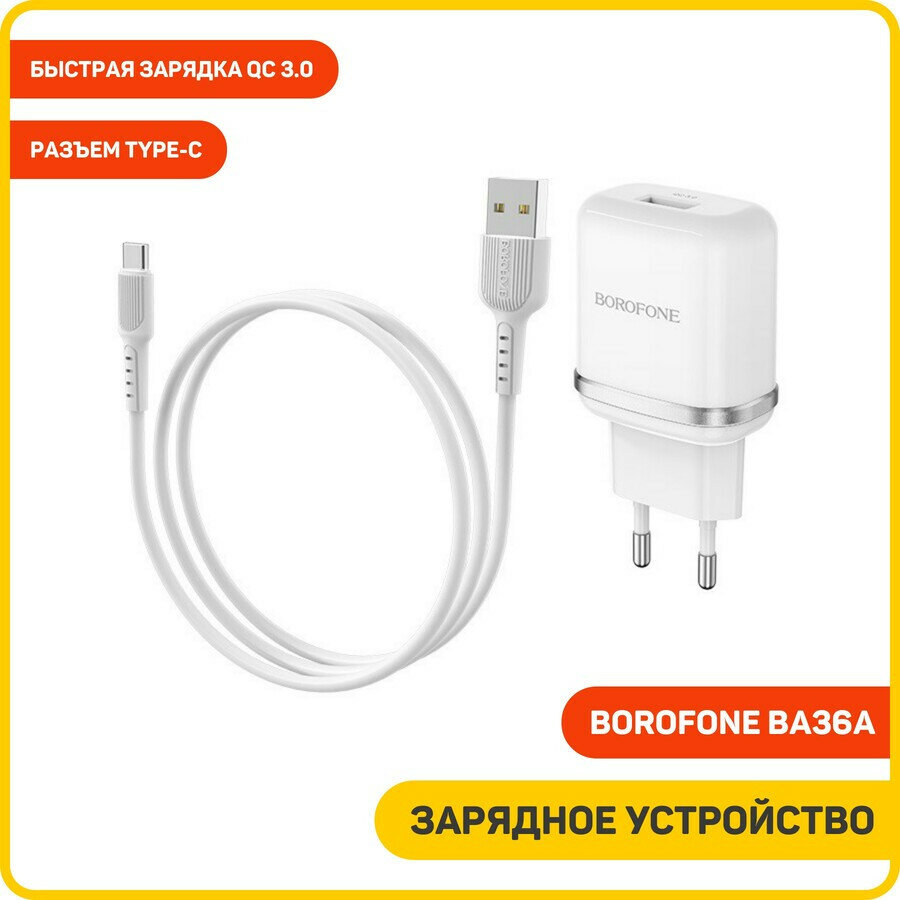 Сетевое зарядное устройство (СЗУ) Borofone BA36A QC 3.0 (USB) + кабель Type-C, 3 А, белый