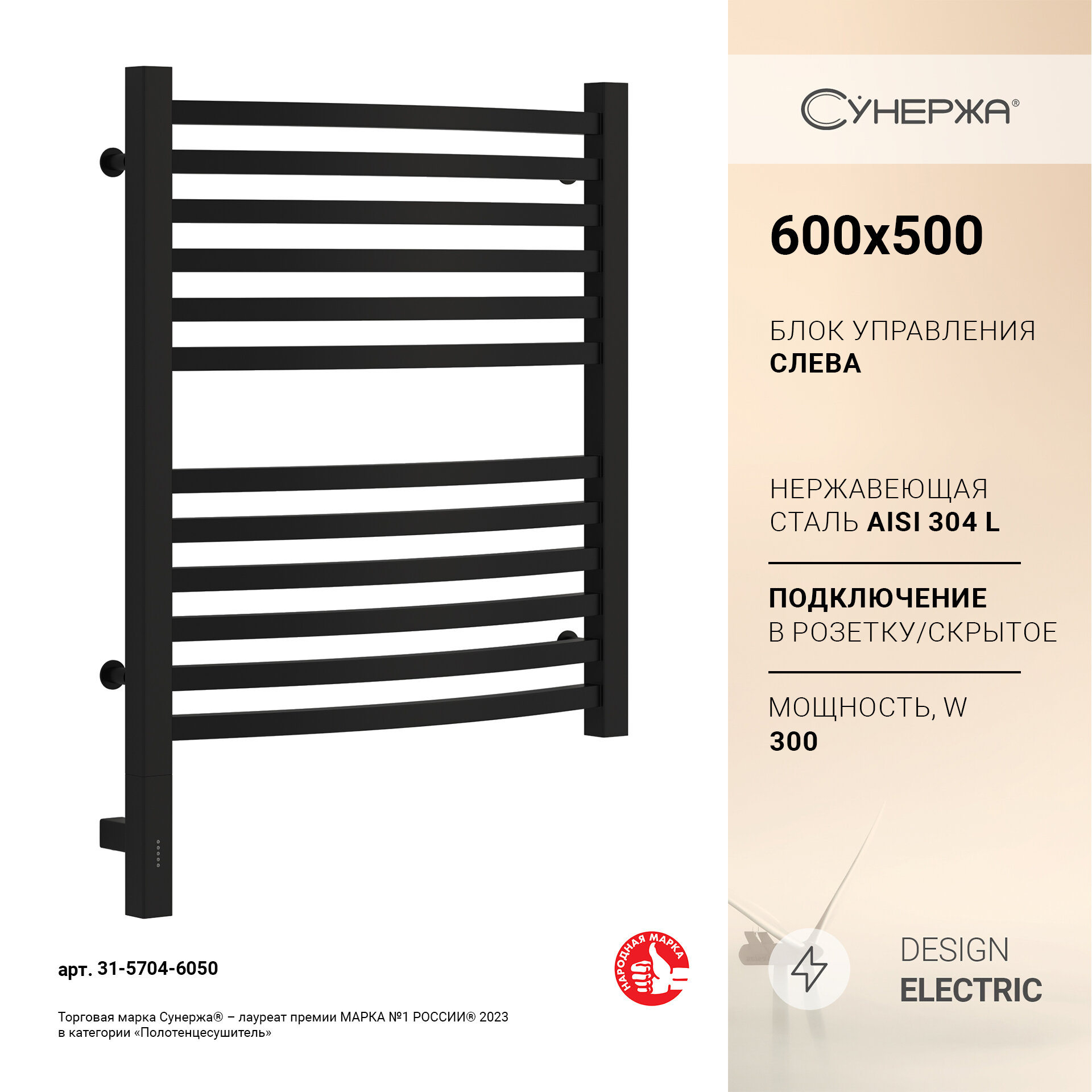 Электрический полотенцесушитель Сунержа Аркус 3.0 600x500 МЭМ Лев. матовый черный арт. 31-5704-6050