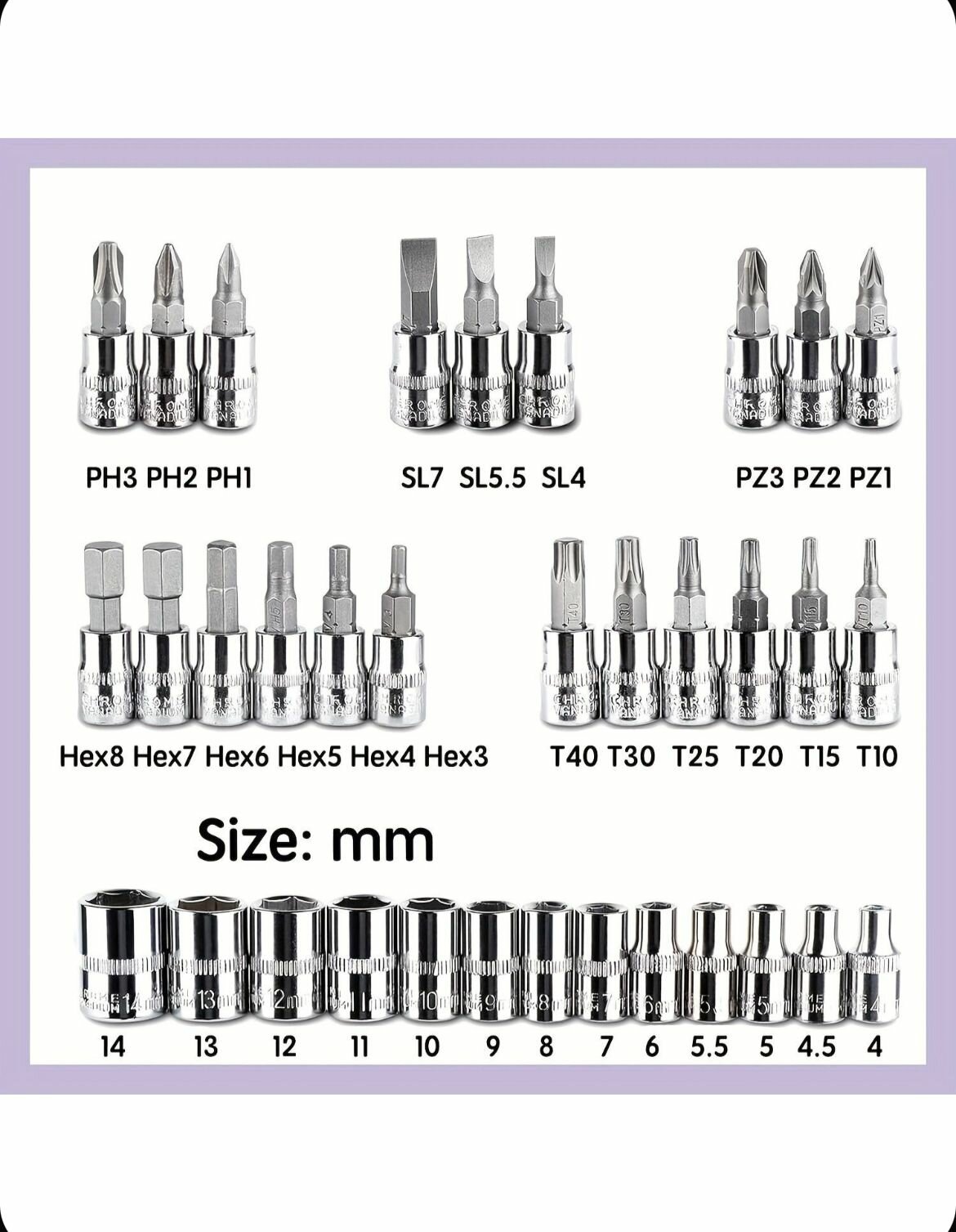 | Дополнительная информация | Головка 1/4" (L-25мм): 4-4,5-5-5,5-6-7-8-9-10-11-12-13-14 мм; Головка-бита НЕХ 1/4": 3-4-5-6 мм; Головка-бита TORX 1/4": Т8-Т10-Т15-Т20-Т25-Т30; Головка-бита SL шлицевая 1/42": 4-5,5-7 мм; Головка-бита PH крестовая 1/4": PH.1-PH.2; Головка-бита PZ крестовая 1/4": PZ.1-PZ.2; Трещотка реверсивная 1/4"; Отвертка-вороток 1/4"; Вороток Т-образный 1/4"; Удлинители 1/4": 50 мм-100 мм; Удлинитель гибкий 1/4"; Кардан шарнирный 1/4"; Шестигранные ключи Г-образные: 1,5-2-2,5 мм |