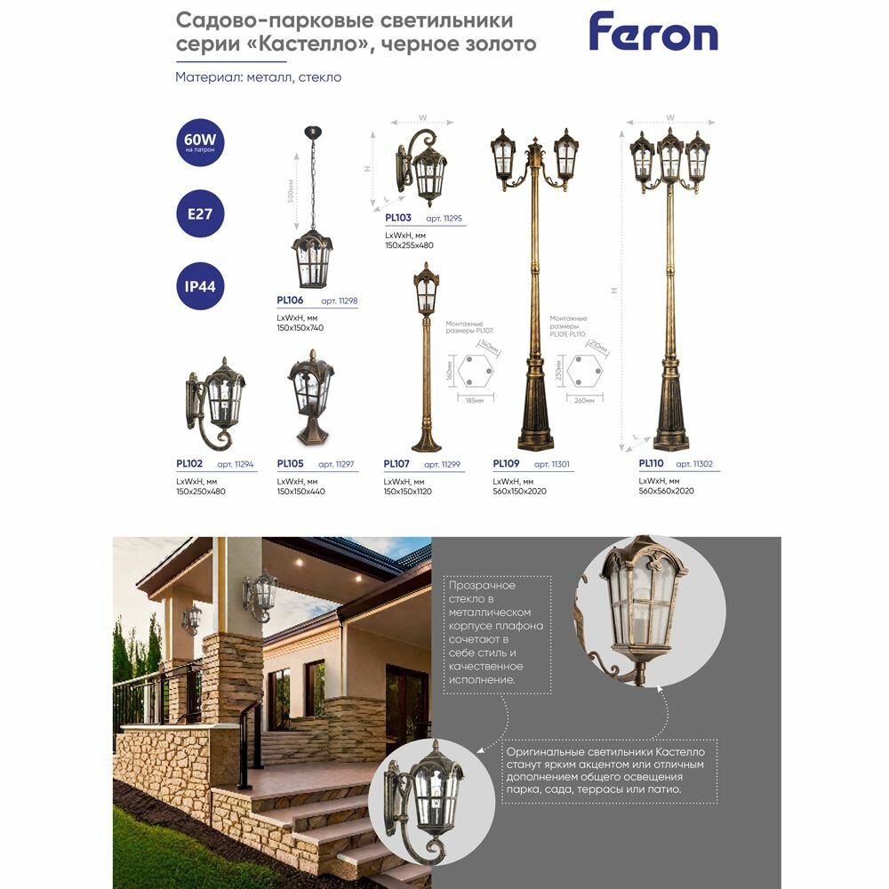 Светильник садово-парковый Feron Кастелло PL102 11294, E27, 60 Вт, цвет арматуры: черное золото, цвет плафона черное золото, 1 шт.