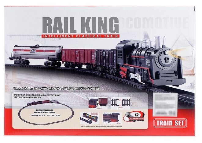 | Дополнительная информация | локомотив — 13 х 3,3 х 4 см; вагон — 16 х 3 х 4 см; ширина пути 2 см; самоходный локомотив |