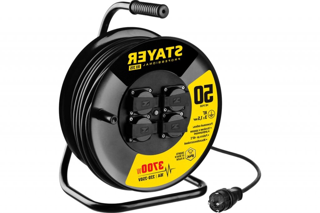 Удлинитель на катушке STAYER 55077-30, 4 розетки, с/з, 16А / 3700 Вт черный 30 м 1.5 м² 4