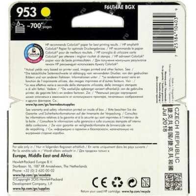 Картридж струйный HP 953 F6U14AE, желтый (700 страниц) для HP OJP 8710/8715/8720/8730/8210/8725