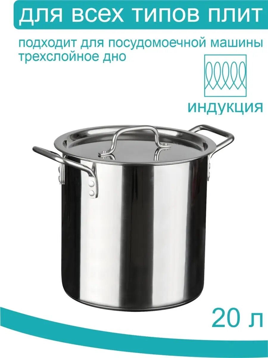 Кастрюля из нержавеющей стали Общепит, 20 л, d=30 см, h=33 см, металлическая крышка, индукция Кату .