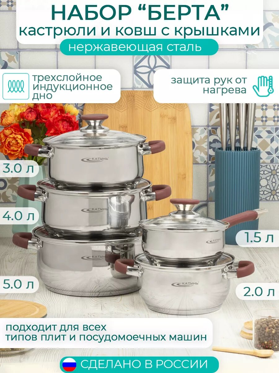 Набор кастрюль Катунь КТ15-C берта 10пр ковш 1,5л +2,0л+3,0л+4,0л+5,0л