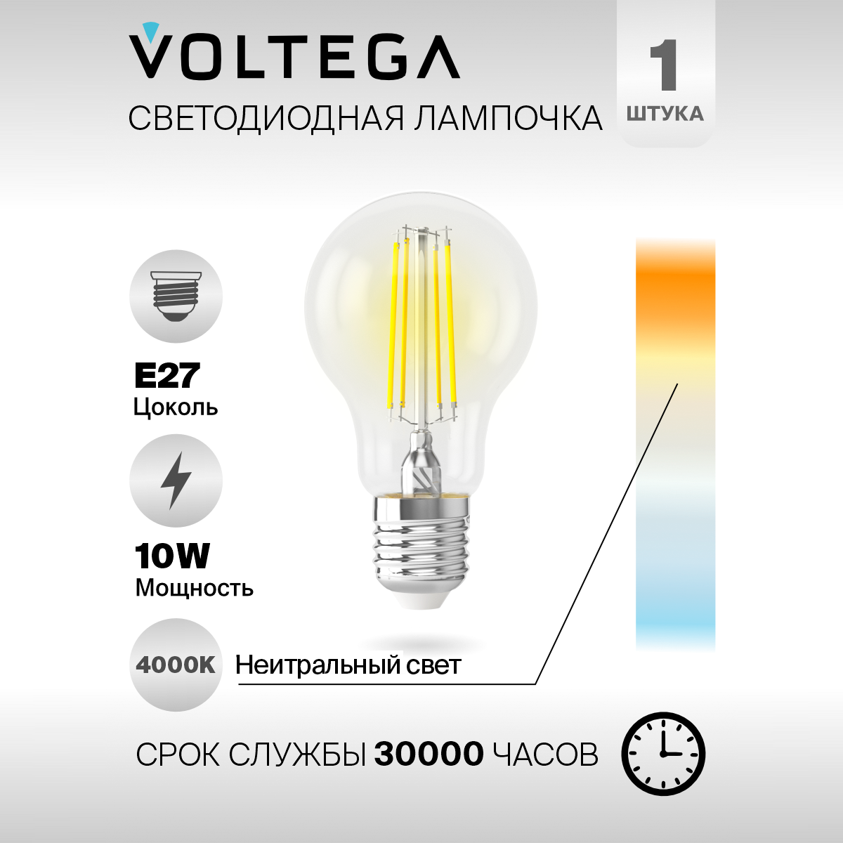 Лампочка светодиодная E27 форма груши 10W нейтральный белый свет Voltega Crystal Graphene A60 4000K упаковка 6 шт.