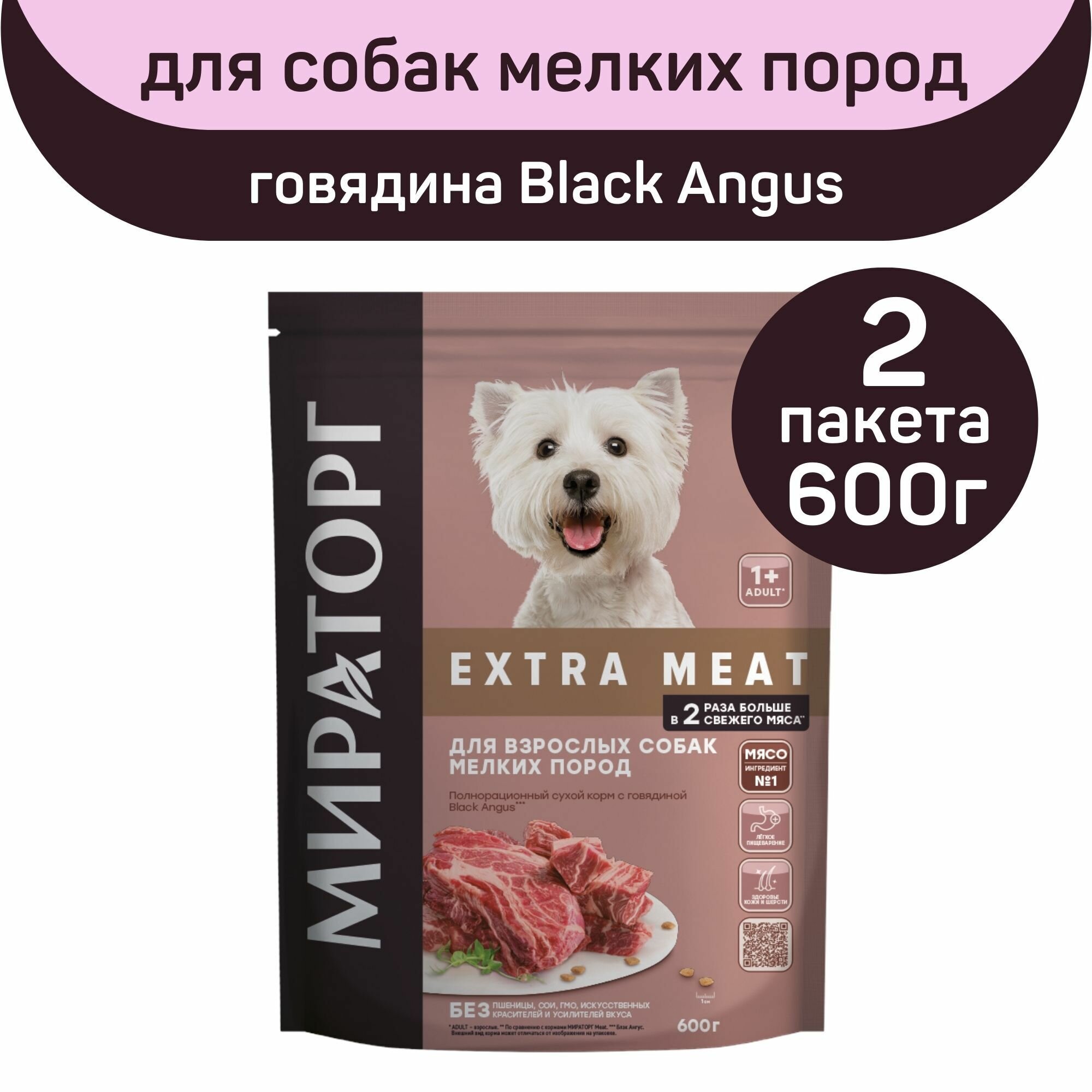 Купить Полнорационный сухой корм Мираторг EXTRA MEAT с говядиной Black Angus для взрослых собак мелких пород старше 1 года, 2 шт по 600 г