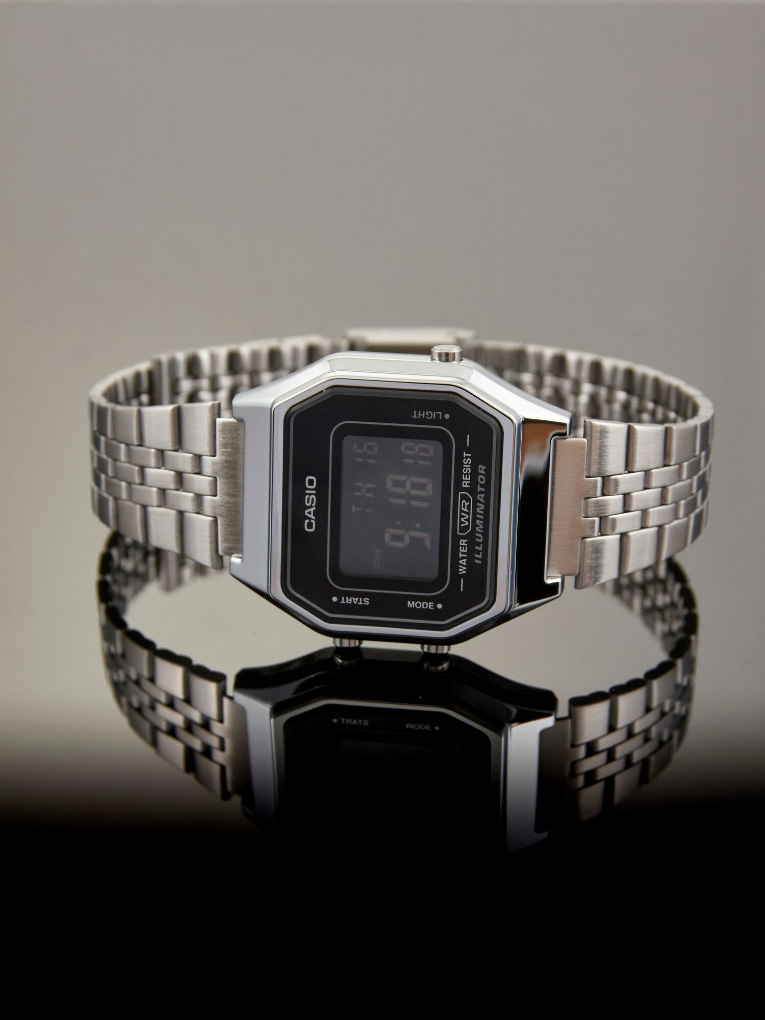 LA680WEA-1E Casio наручные часы кварцевые WR30 (3 атм) женские серебряный секундомер будильник отображение дня недели, отображение числа подсветка дисплея акриловое стекло