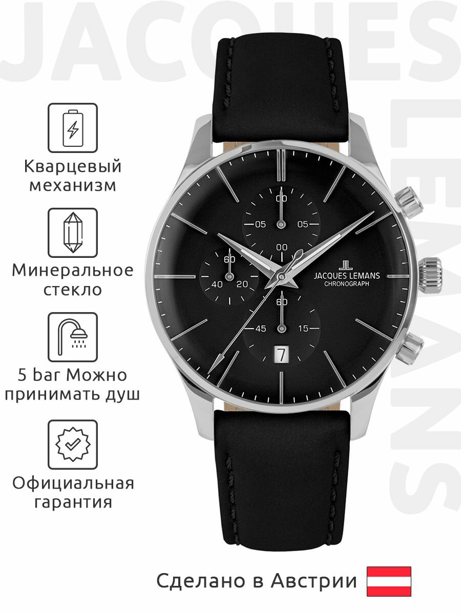Наручные часы Jacques Lemans 1-2163D, мужские кварцевые классические часы Жак Леман с хронографом и датой на кожаном ремне
