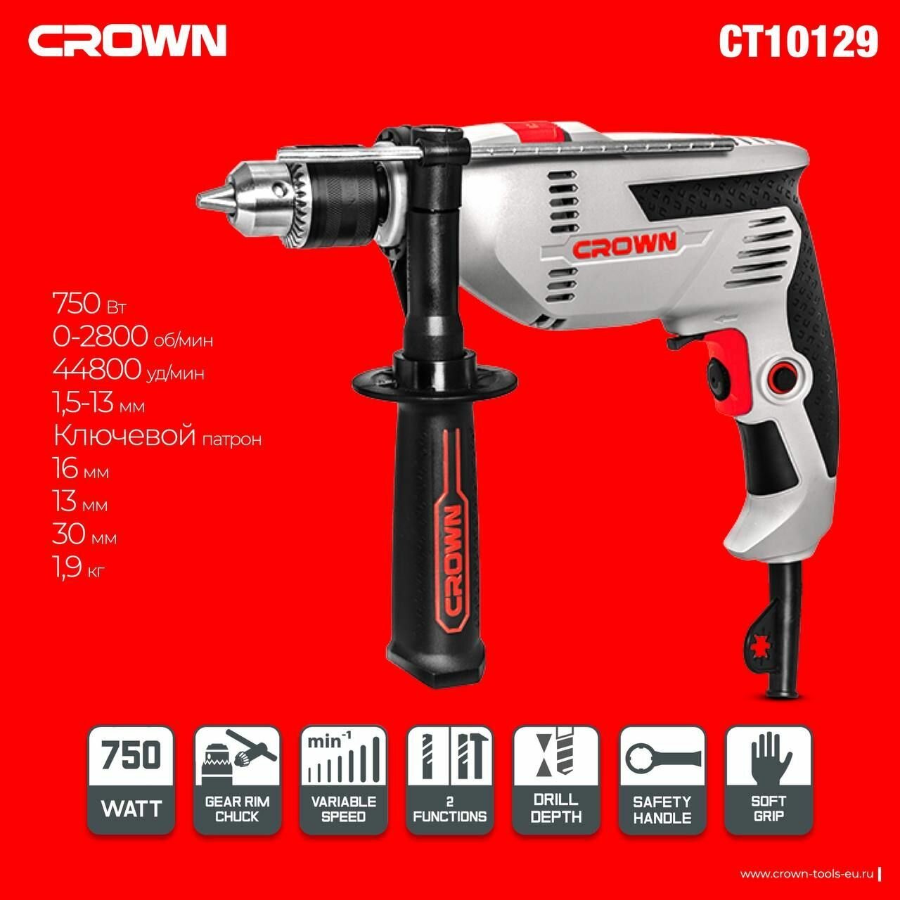 Дрель CROWN CT10129; дрель ударная; 750 Вт интересное: