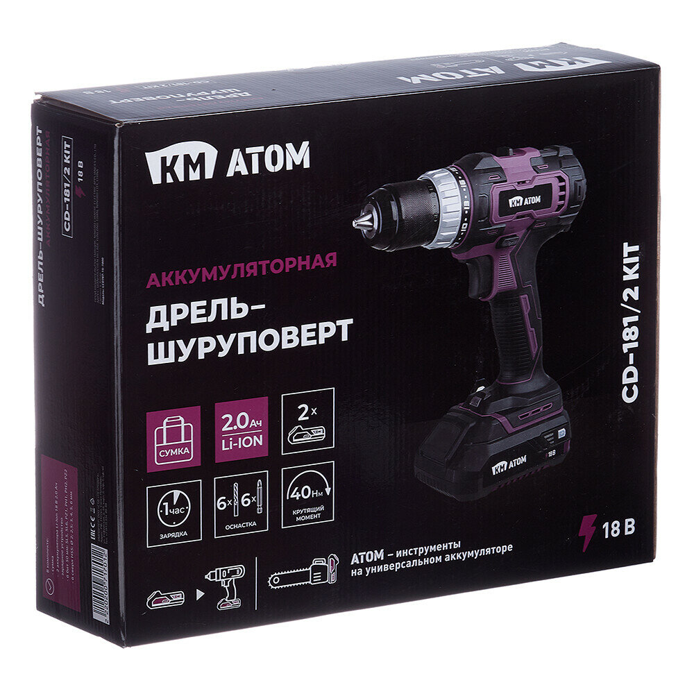 Купить Дрель-шуруповерт аккумуляторная КМ АТОМ 18В 2Ач Li-Ion 2 АКБ и ЗУ (CD-181/2 KIT)