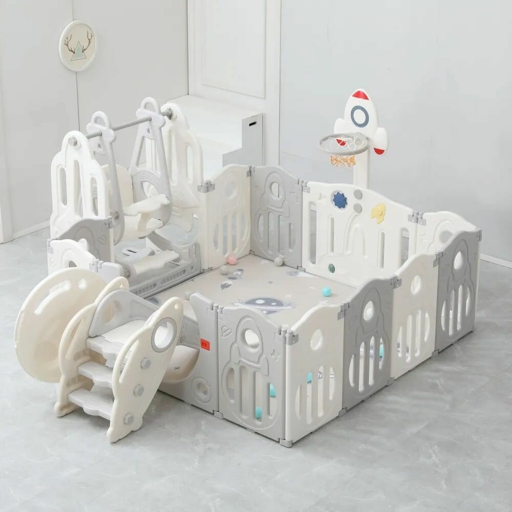 Манеж UNIX Kids "SUPREME Space" Grey, серый/белый, 160x160 см, с ковриком, горкой и баскетбольным кольцом для дома, улицы