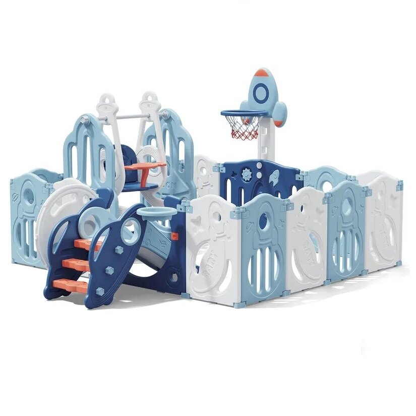 Манеж UNIX Kids "SUPREME Space" Blue, голубой/синий, 160x160 см, с ковриком, горкой и баскетбольным кольцом для дома и улицы