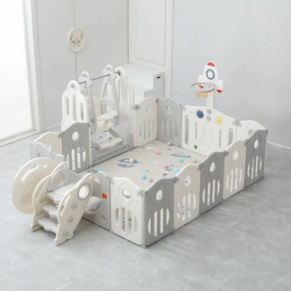 Манеж UNIX Kids "SUPREME Space" Grey, серый/белый, 160x160 см, с ковриком, горкой и баскетбольным кольцом для дома, улицы