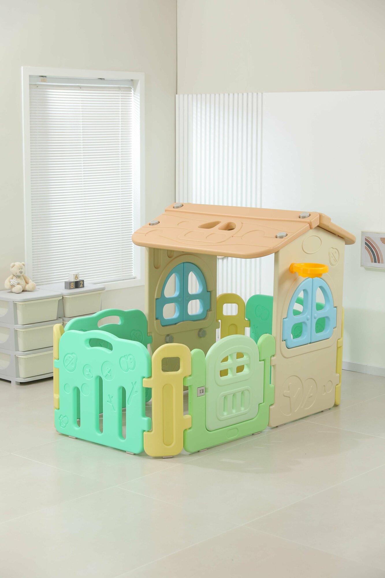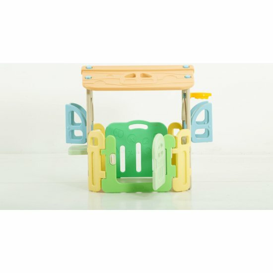 Большой детский игровой манеж, комплекс с качелями UNIX Kids DeLuxe House 150x180 Camel из пластика, с игровым домиком, баскетбольной стойкой, доской для рисования, для дома и улицы, бежевый