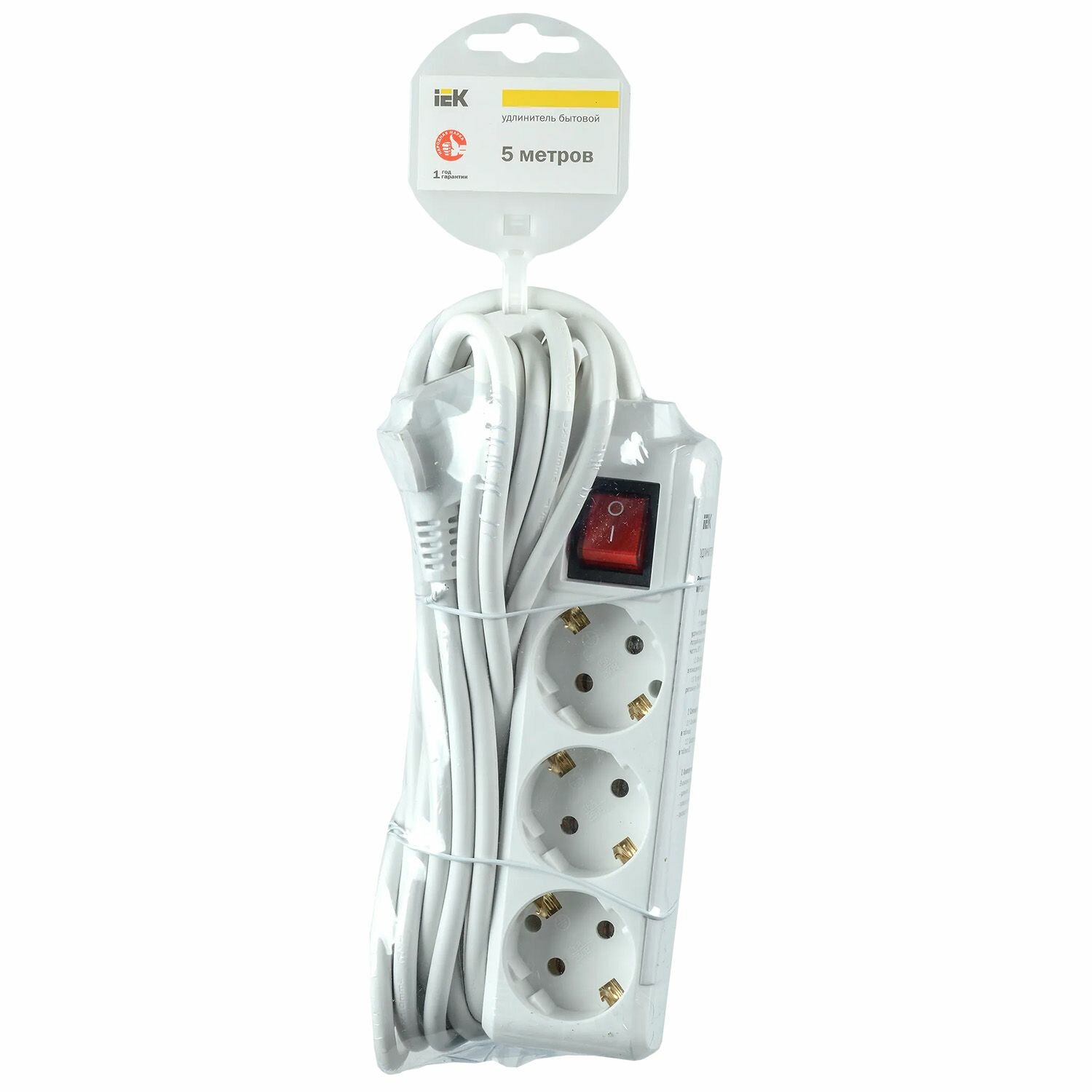 Удлинитель с выключателем IEK У03К-выкл, ПВС 3 x 1 мм², с заземлением, 3 розетки, 5 м, белый