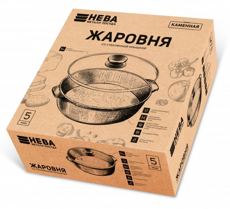 Жаровня 2,5 л Нева Литая Каменная Черный гранит 186525, черный гранит, крышка стекло