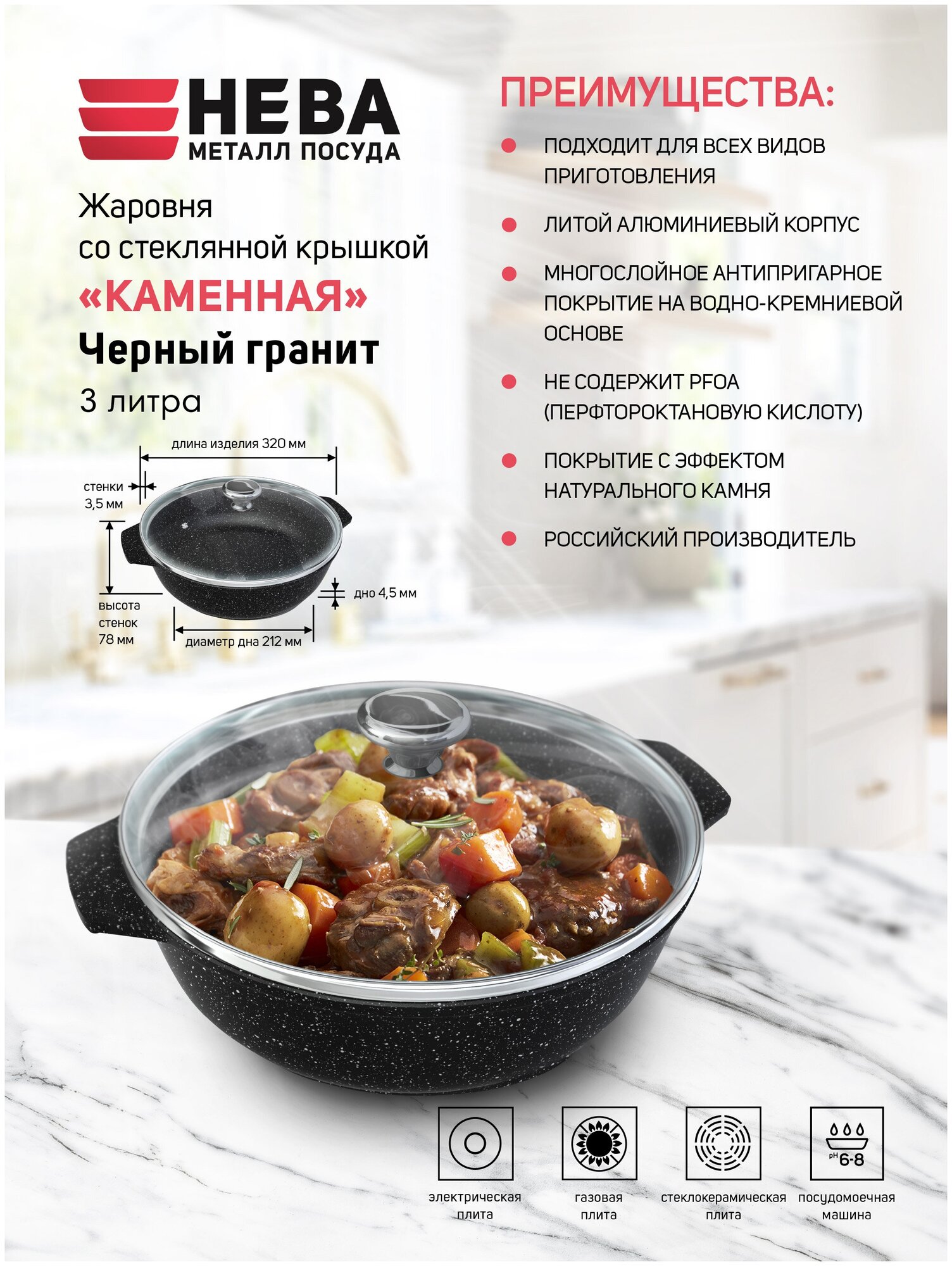 Жаровня 2,5 л Нева Литая Каменная Черный гранит 186525, черный гранит, крышка стекло