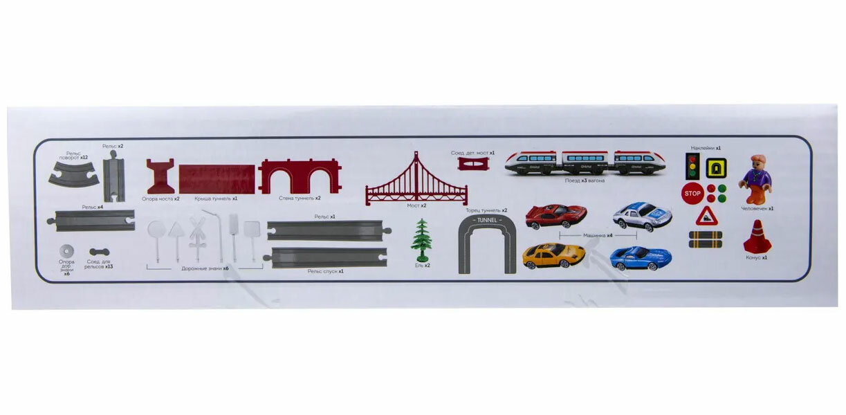 Достаточно много деталей чтобы собирать различные варианты дороги, есть тунель и мост. В комплекте есть машинки и дорожные знаки. |