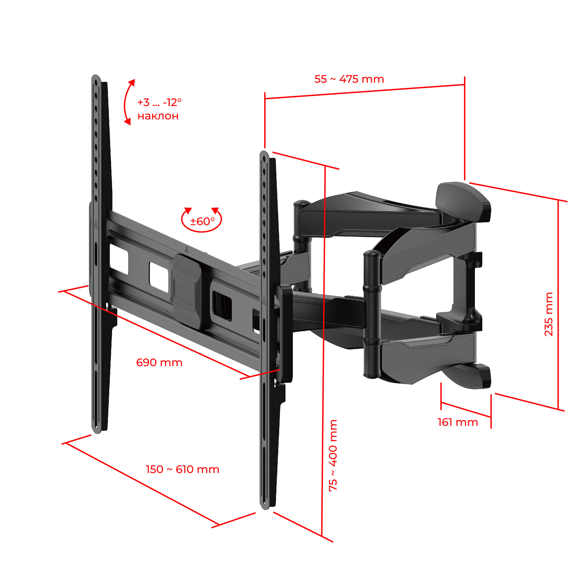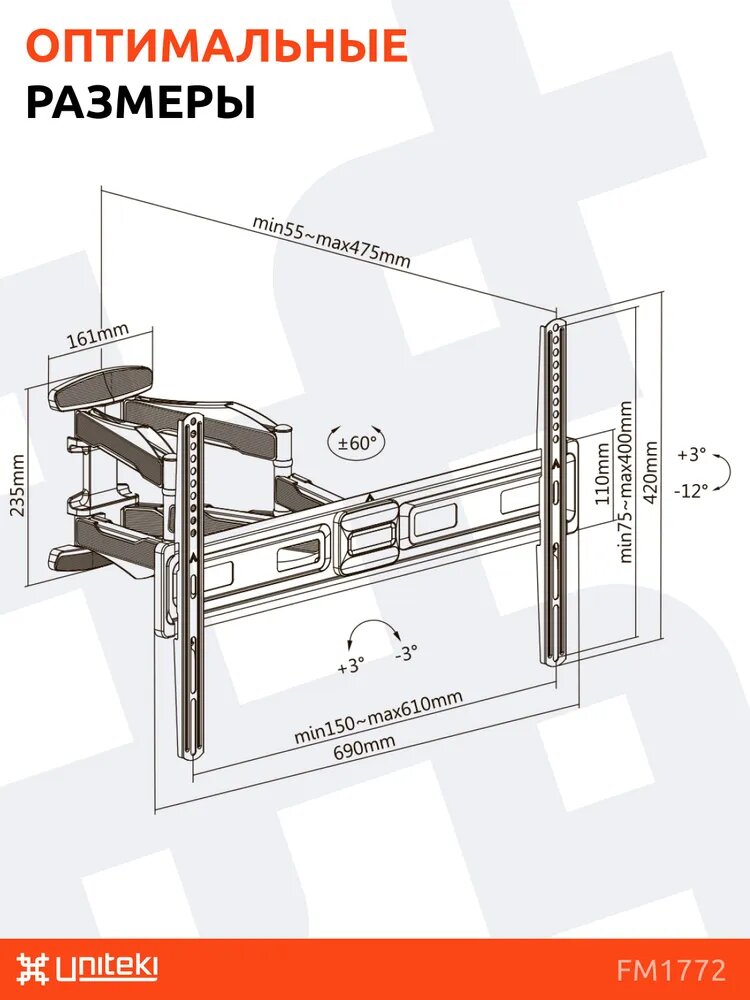 Кронштейн для телевизора на стену выдвижной наклонно поворотный для диагонали от 37 до 80 дюймов UniTeki FM1772 черный интересное:
