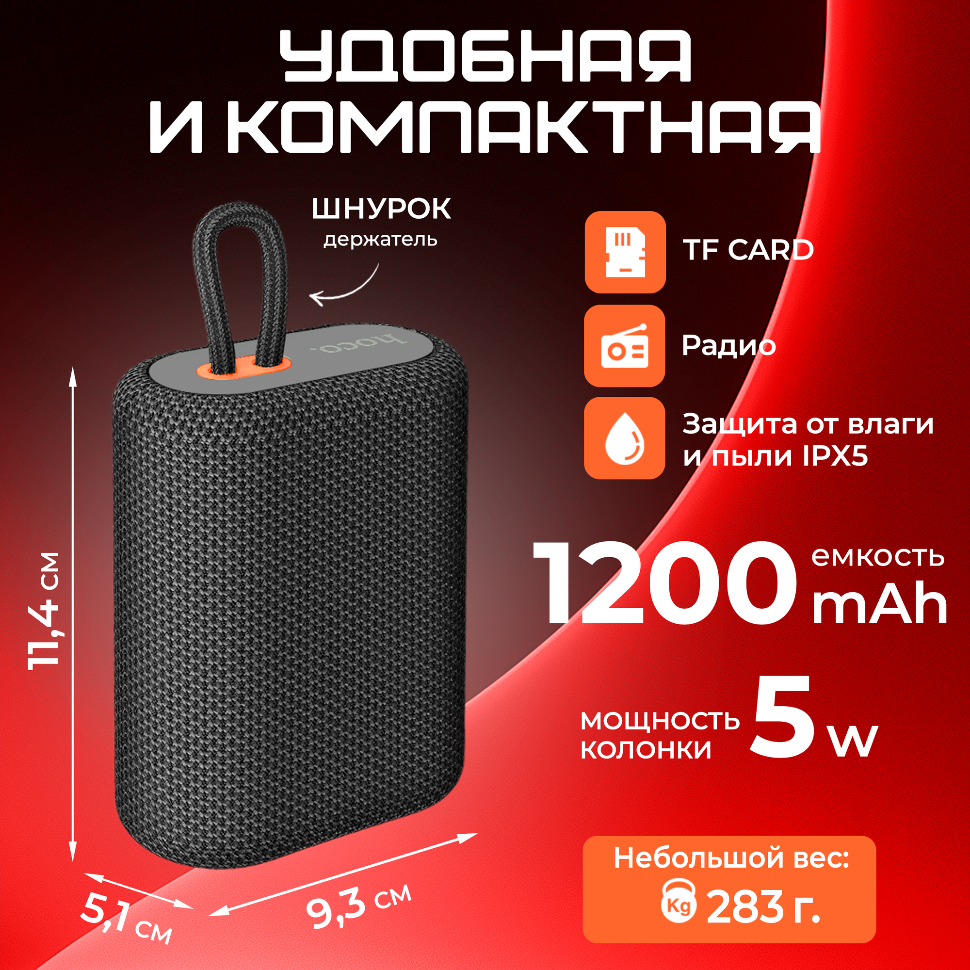 Hoco Портативная колонка Hoco BS47, 5 Вт, 1200 мАч, BT5.0, microSD, красная