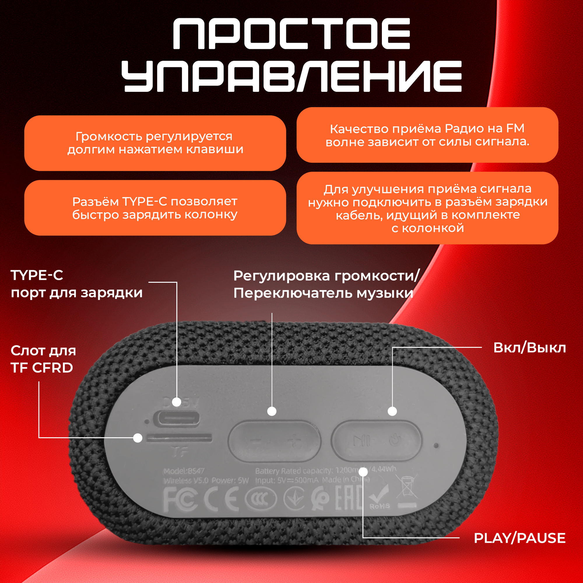 Колонка портативная HOCO BS47 красный (5W, microSD, USB, FM, BLUETOOTH, микроф., аккум.), HOCO электротовар