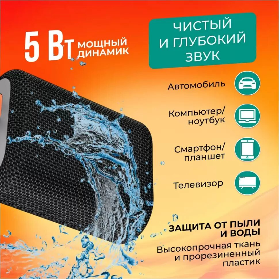 Портативная колонка TFN Quadro, 3Вт, Bluetooth 5.0, microSD, microUSB, IPX6, 1500мАч, черная