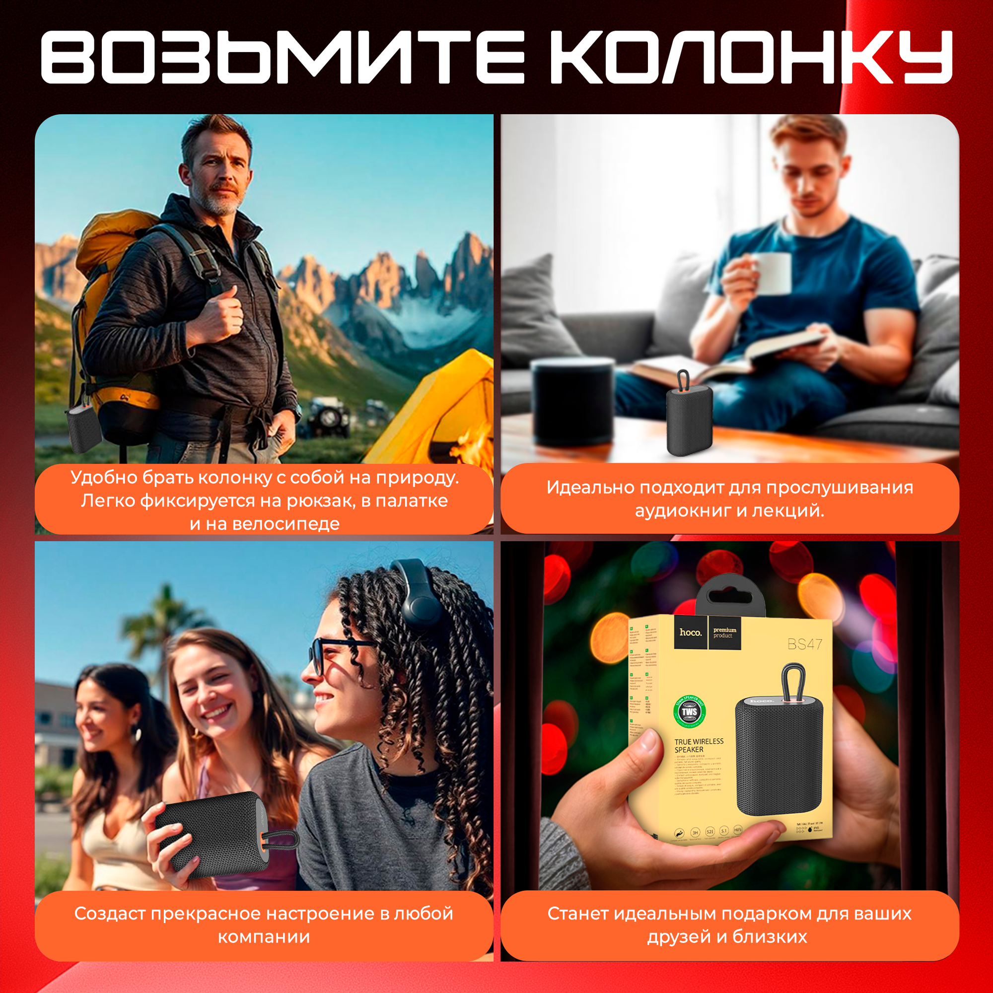 Портативная колонка HOCO BS47, красный, ткань