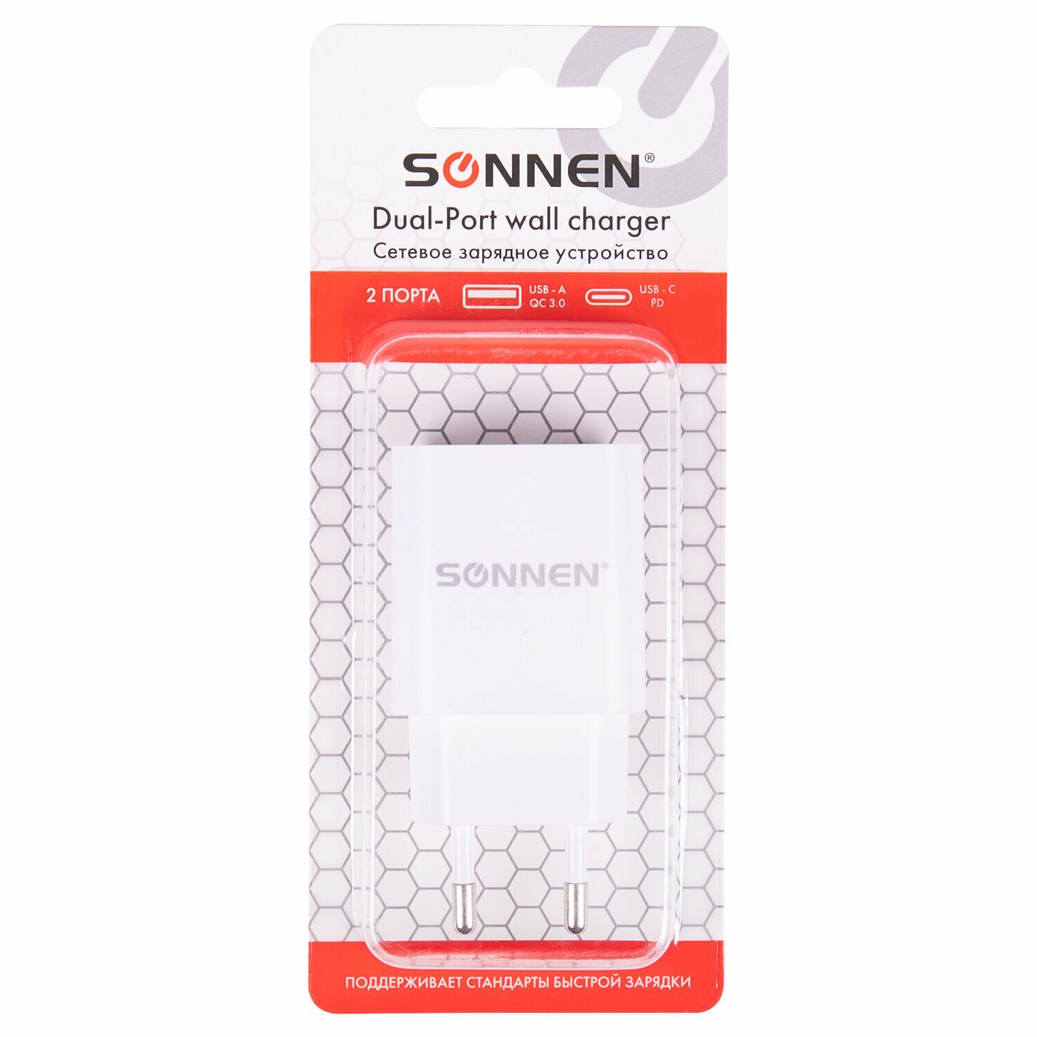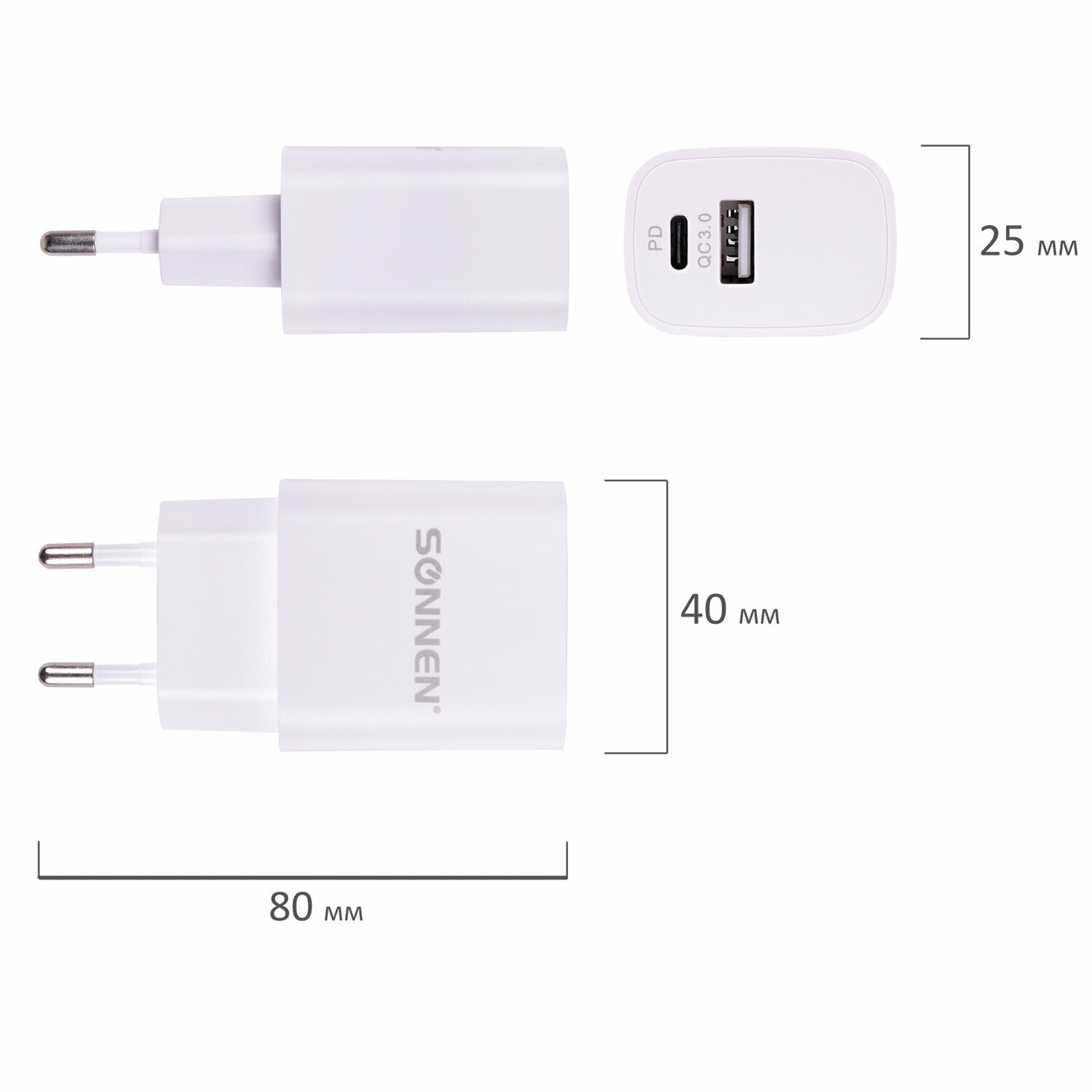 Зарядное устройство быстрое сетевое (220 В) SONNEN, USB QC 3.0 + Type-C PD 20 Вт, 3 А, белое, 455505