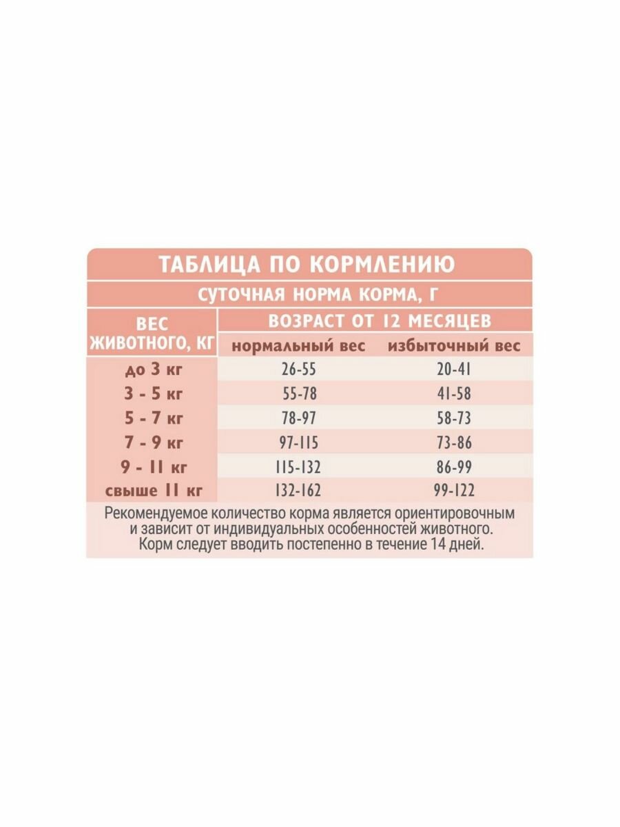 | Дозировка | вес кошки 2-3кг - 30-46 г/день вес кошки 3-5 кг -46-67 г/день вес кошки 5-7 кг - 67-80 г/день вес кошки 8-10 кг - 91-114 г/день |