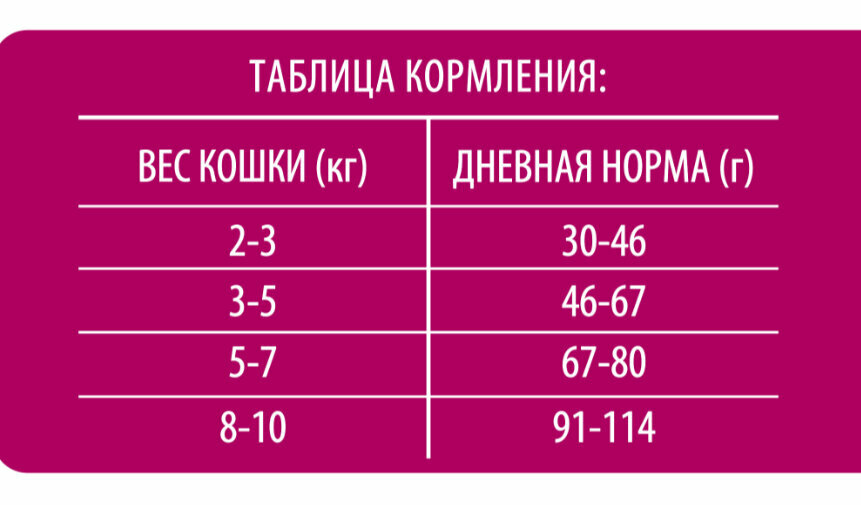 | Дозировка | вес кошки 2-3кг - 30-46 г/день вес кошки 3-5 кг -46-67 г/день вес кошки 5-7 кг - 67-80 г/день вес кошки 8-10 кг - 91-114 г/день |