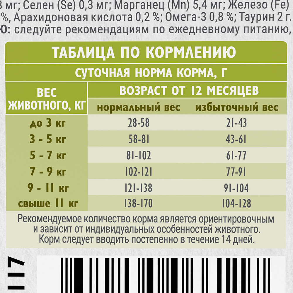 | Дозировка | вес кошки 2-3кг - 30-46 г/день вес кошки 3-5 кг -46-67 г/день вес кошки 5-7 кг - 67-80 г/день вес кошки 8-10 кг - 91-114 г/день |