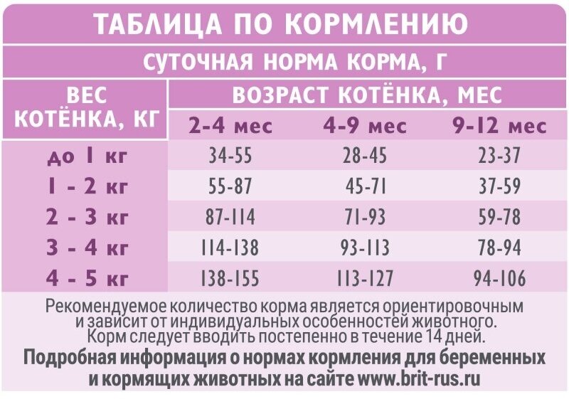 | Дозировка | вес кошки 2-3кг - 30-46 г/день вес кошки 3-5 кг -46-67 г/день вес кошки 5-7 кг - 67-80 г/день вес кошки 8-10 кг - 91-114 г/день |