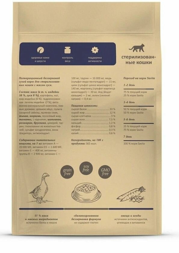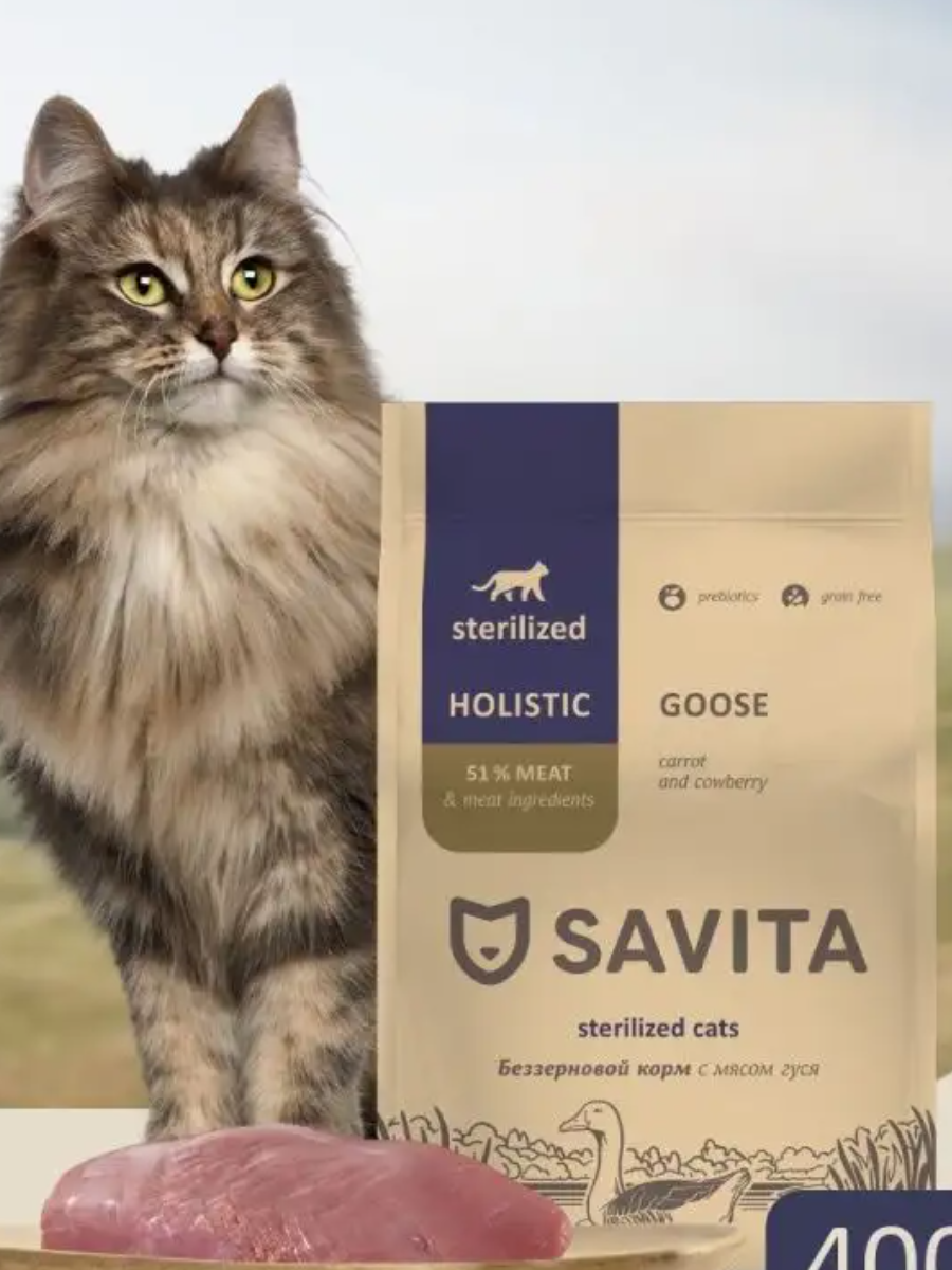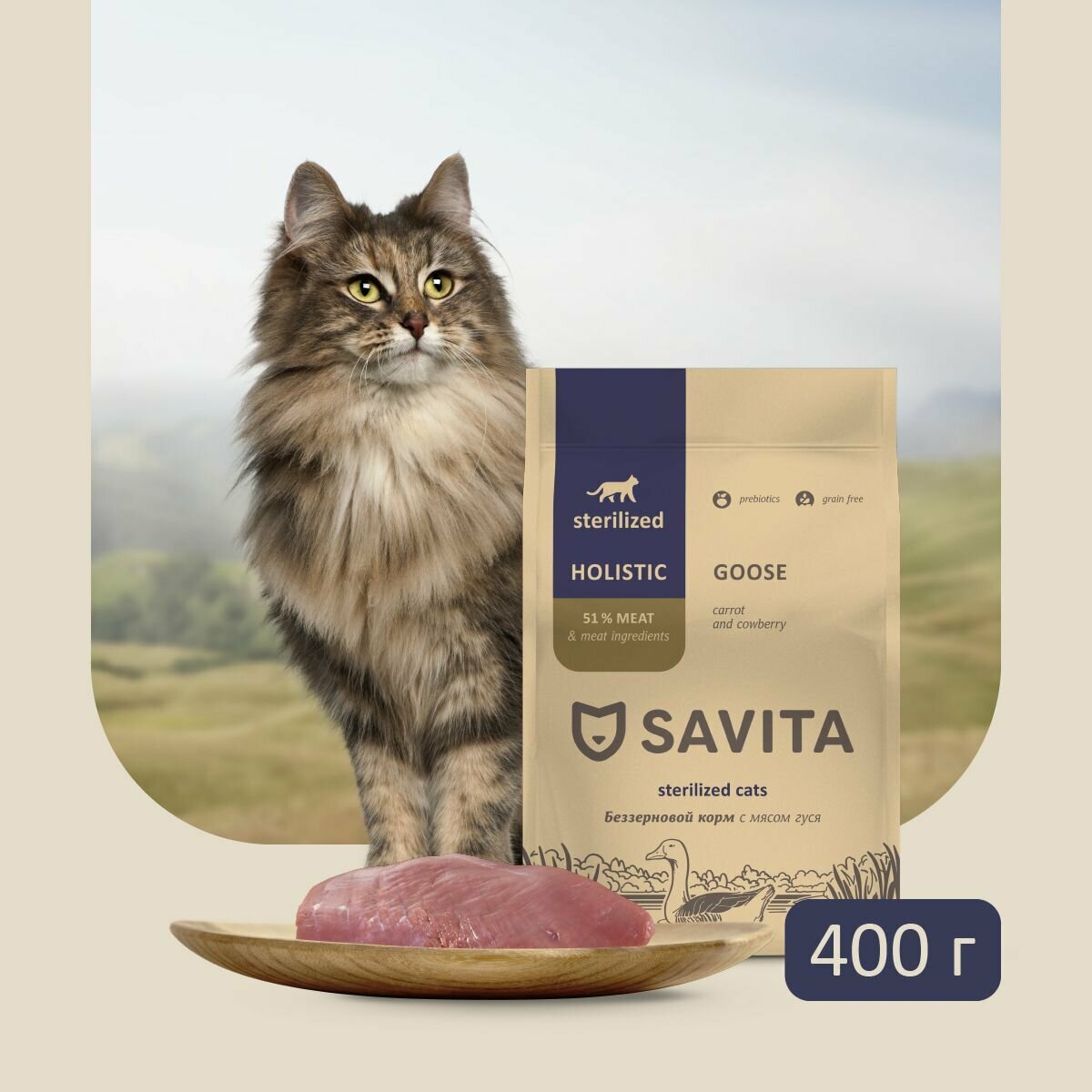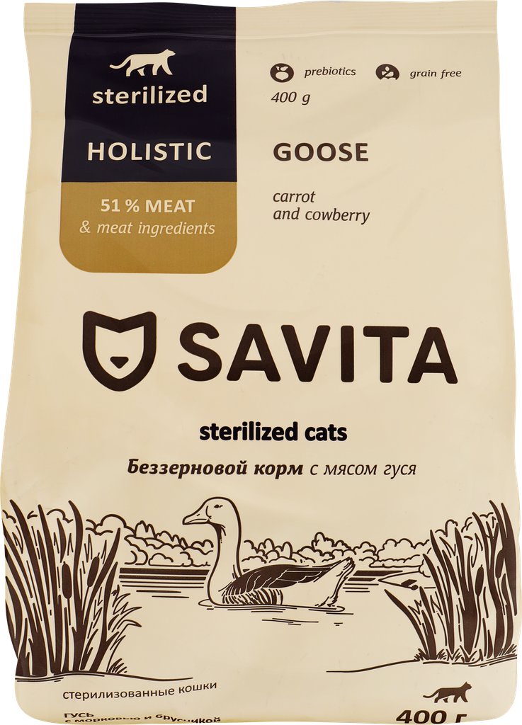 СохранитьCухой корм для стерилизованных кошек SAVITA, беззерновой класса HOLISTIC со свежим мясом гуся, морковью и тыквой, 400 грамм. интересное: