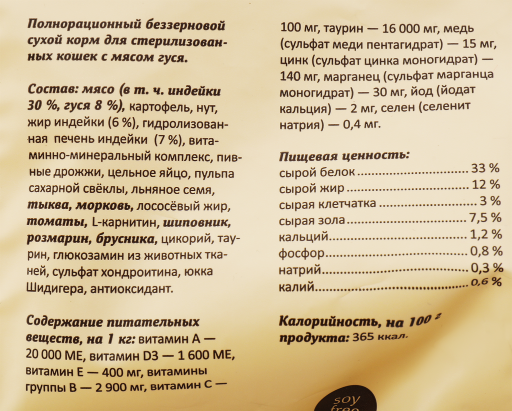 А также высокое содержание витамина А: 20000 МЕ. И витамина D: 1600 МЕ. Остальные ингредиенты тоже натуральные. Кошкам (18 лет и 4 года) очень понравился запах. Едят с удовольствием. Я его даю в смеси с другими кормами: делаю ассорти |