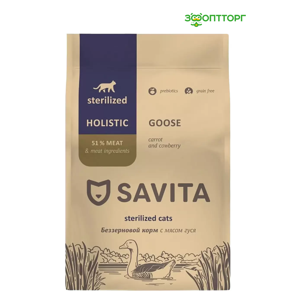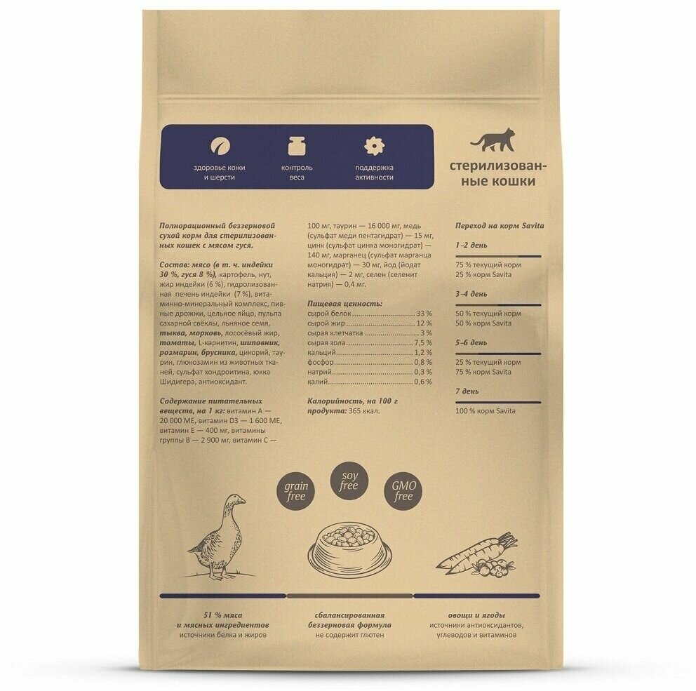 SAVITA Беззерновой корм для стерилизованных кошек с мясом гуся, 2 кг